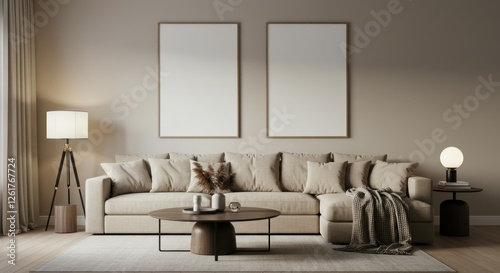 Fototapeta premium Minimalist living room, neutral color palette, beige sofa, wooden coffee table, floor lamp, table lamp, textured wall, framed art prints, cozy interior design, natural light, earthy tones, contemporar
