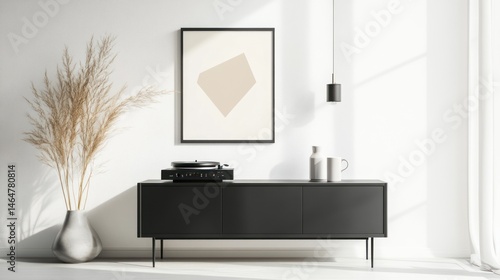 Fototapeta premium Minimalist living room, record player, artwork, sunlight, decor