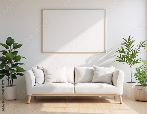 Fototapeta premium Minimalist Living Room with Blank Frame and Cozy Sofa in Sunlit Space
