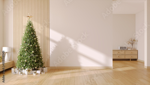 Naklejka premium Minimalist Living Room with Christmas Tree and Gift Boxes , and Wooden Floor...