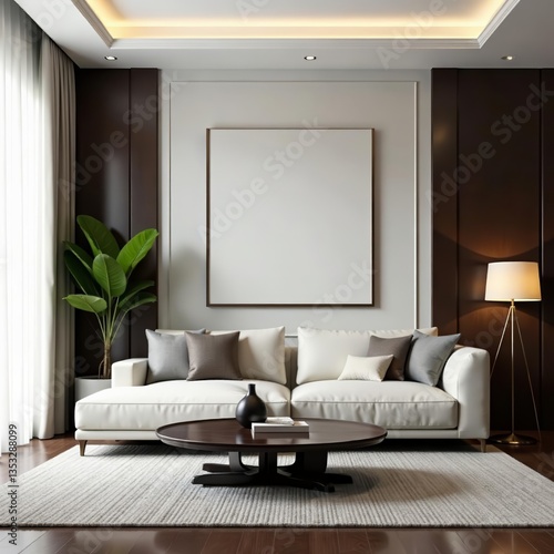 © Prisana, Fototapeta premium Minimalist living room with elegant sofa, luxury accents, design, modern