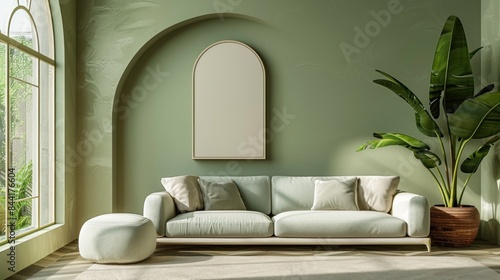 Fototapeta premium Minimalist Living Room with Green Walls and a Lush Plant