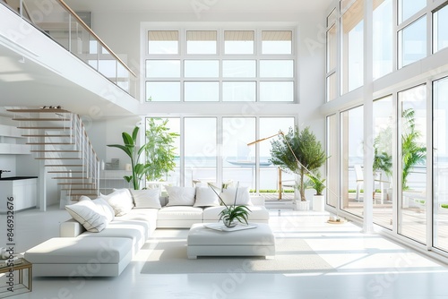 Fototapeta premium minimalist living room with large windows and loft interior modern design in bright airy space 3d illustration