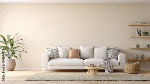 Fototapeta premium Minimalist Living Room with Neutral Cream Decor and Cozy Touches