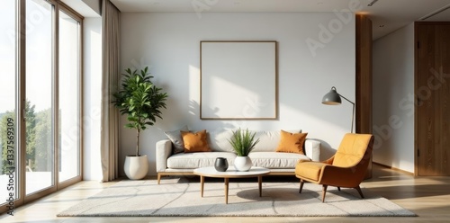 Obraz premium Minimalist living room with sleek furniture and geometric rug, cozy,...