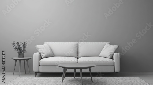 © azi, Fototapeta premium Minimalist living room with sofa, coffee table, and plant.