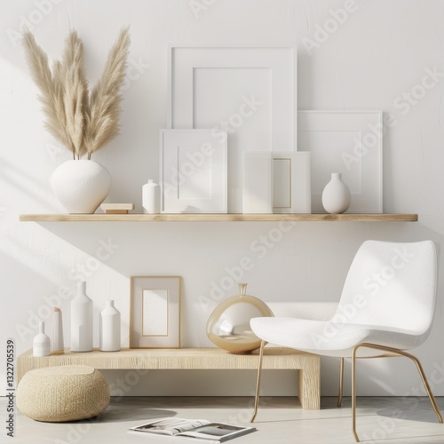 © SUUGOIisME, Obraz premium Minimalist living room with white chair. wooden shelves and pampas grass in vase