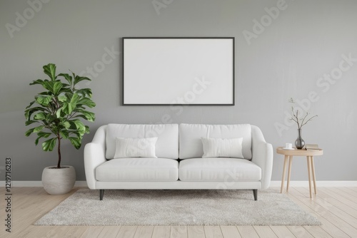 © darshika, Fototapeta premium Minimalist living room with white sofa a potted plant and a framed artwork.