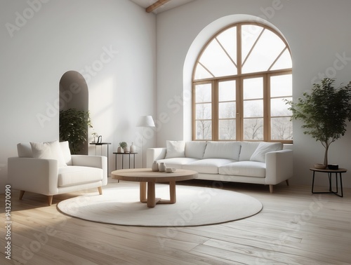 Fototapeta premium Minimalist Living Room with White Sofa and Arched Windows