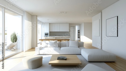 Fototapeta premium Minimalist Living Room with White Sofa and Wooden Coffee Table