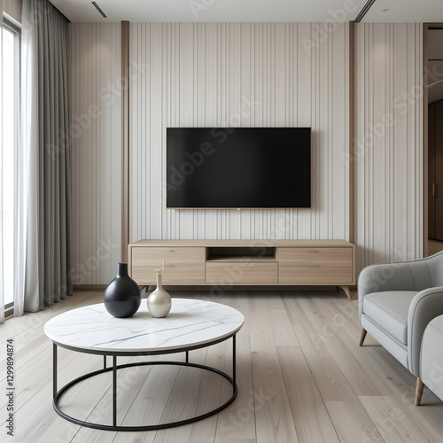© Sad, Naklejka premium Minimalist Living Room | Wood-Like Paneling & Mounted TV
