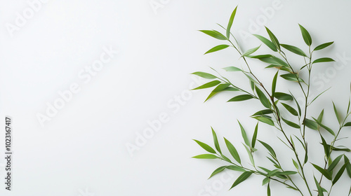 © Jae, Naklejka premium Minimalist lucky bamboo green leaves frame on white background with copy space, Eco-friendly design background with Text space.