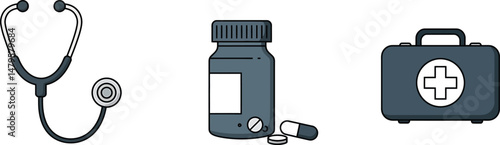 Fototapeta premium Minimalist Medical Icons: Stethoscope, Pills, First Aid Kit