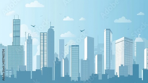 Fototapeta premium Minimalist Modern City BusinessBackdrop: Sequential Flat Buildings, Busy Streets, Clean Lines, Fresh Blue Sky, Abstract Elements Fusion