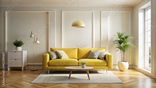 Fototapeta premium Minimalist Modern Living Room with Yellow Sofa, Bright Interior Design