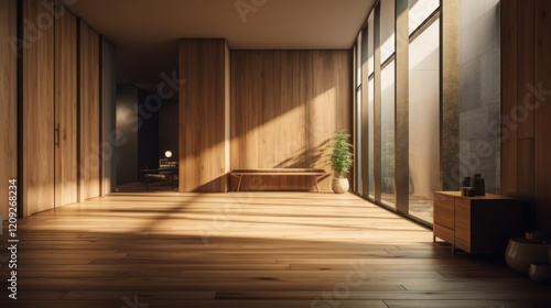© video, Fototapeta premium Minimalist Modern Wooden Room with Skylight and Large Windows Overlooking Nature
