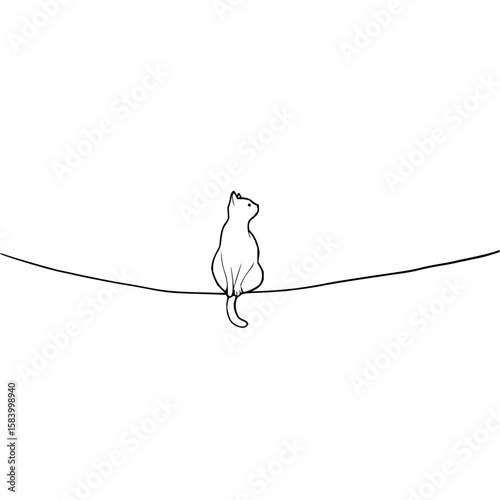 Fototapeta premium Minimalist monochromic line art illustration of cat balancing telephone wire...
