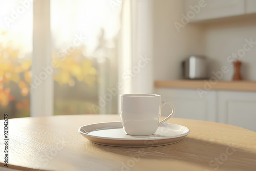 Fototapeta premium Minimalist Morning Scene with White Coffee Cup in Sunlit Kitchen