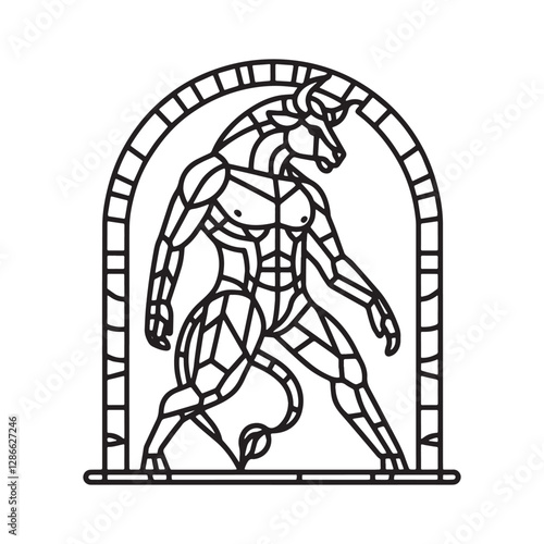 © Cici, Fototapeta premium Minimalist Mosaic Outline of a Minotaur in an Arc Window Illustration