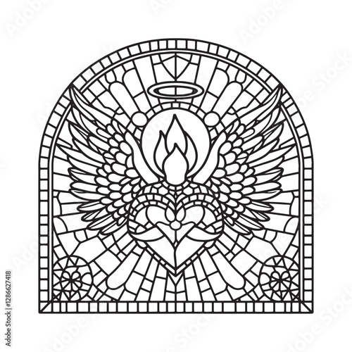 Fototapeta premium Minimalist mosaic outline of angel with blazing heart inside arc window
