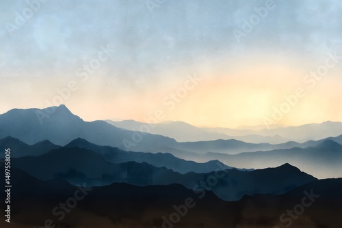 Obraz premium Minimalist mountain range landscape view with layers of peaks and hazy sky....