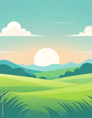 © HORA STUDIO, Obraz premium Minimalist mountain scene with trees, flat design.