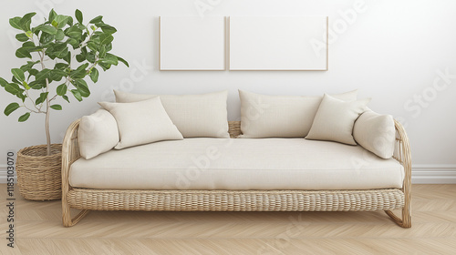 Fototapeta premium Minimalist Natural Woven Sofa with Neutral Tones and Cozy Living Room Decor