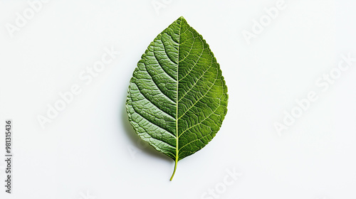 © Ihor, Fototapeta premium Minimalist Nature: Green Leaf Suspended in the Center of a White Backdrop