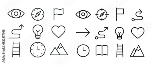 Naklejka premium Minimalist navigation and inspiration icons set: compass, map, heart, arrow, clock, ladder