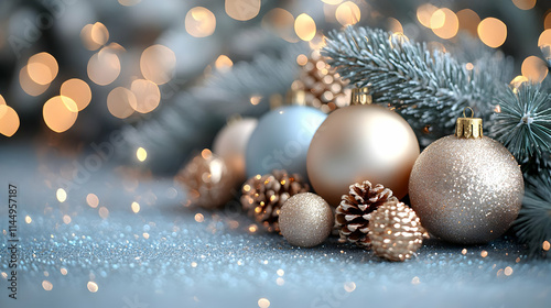 © Nuttamon, Fototapeta premium Minimalist New Year Decorations Close-Up Elegant Neutral Colors Simple Sophisticated Tabletop Concept