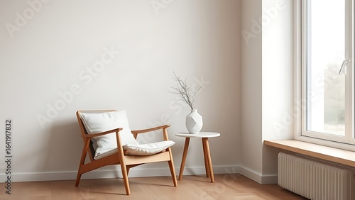 Fototapeta premium Minimalist Nordic-style chair and side table with a geometric vase, creating...