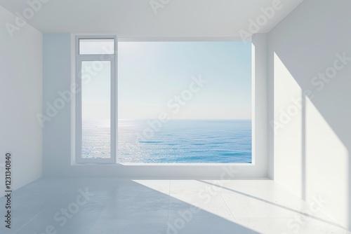 © Natasha , Obraz premium Minimalist ocean view: sunlit room with large window overlooking tranquil sea horizon.