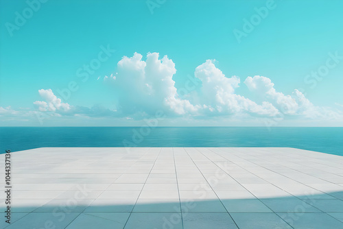 Obraz premium Minimalist Ocean View with White Tiles, sea, sky, clouds, blue, floor