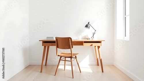 Fototapeta premium Minimalist office corner with wooden desk and chair, bathed in natural window...