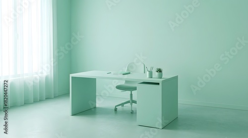 © TGEN, Fototapeta premium Minimalist office interior with teal color scheme and modern furniture