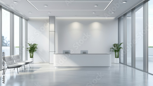 Fototapeta premium Minimalist office reception area with white furniture, large windows, and...