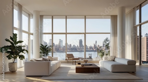 Fototapeta premium Minimalist office space with large windows and modern decor.
