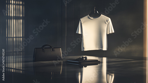 Obraz premium Minimalist Office Workspace with White T Shirt and Business Accessories