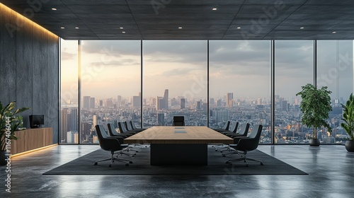 Fototapeta premium minimalist open-plan office interior, featuring floor-to-ceiling windows overlooking a modern city