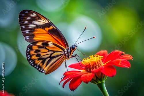 © Four888, Fototapeta premium Minimalist Orange & Black Butterfly on Red Flower