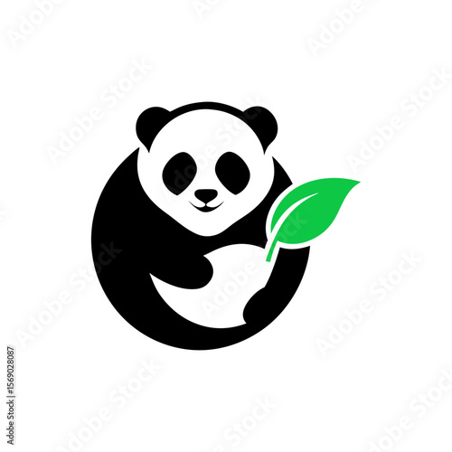 Fototapeta premium Minimalist panda holding leaf logo in cute rounded form for natural branding concept