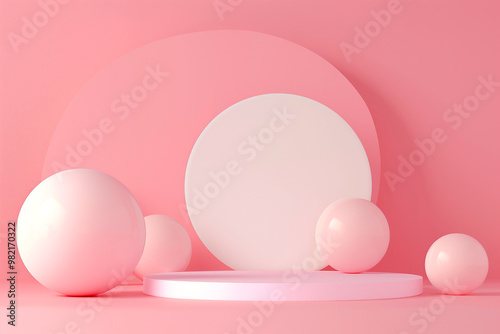 Fototapeta premium Minimalist podium surrounded by abstract balls on a pink pastel background