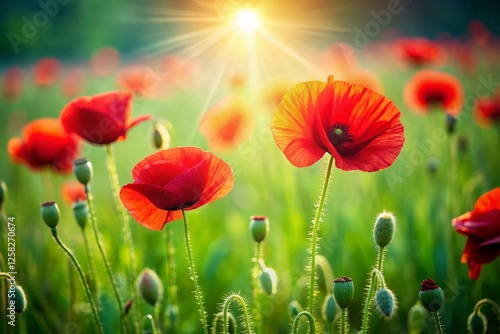 © Danicha, Fototapeta premium Minimalist Poppy Field: Vibrant Red Flowers in Simple Landscape