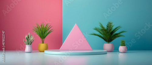 Obraz premium Minimalist Product Display With Pink Triangle And Plants