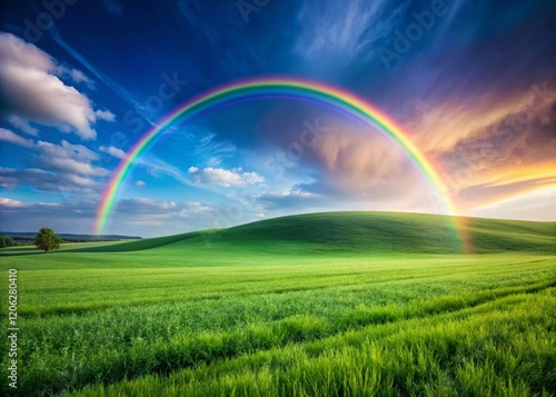 © Arnada, Obraz premium Minimalist Rainbow Over Green Field - Peaceful Nature Background