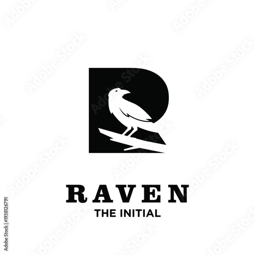© Alpha Factory Std, Obraz premium Minimalist Raven Bird Silhouette Perched on Branch Logo with Initial Letter R Design