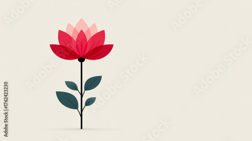 Naklejka premium Minimalist red lotus flower on beige background with green leaves