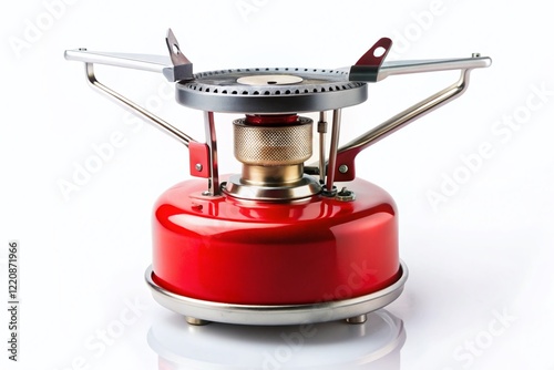 © Man888, Obraz premium Minimalist Red Portable Camping Gas Stove Isolated on White Background