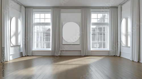© Hambaa, Fototapeta premium Minimalist Room Design With Large Windows and Blank Artwork