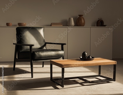 Fototapeta premium Minimalist room with chair, table, and cabinet